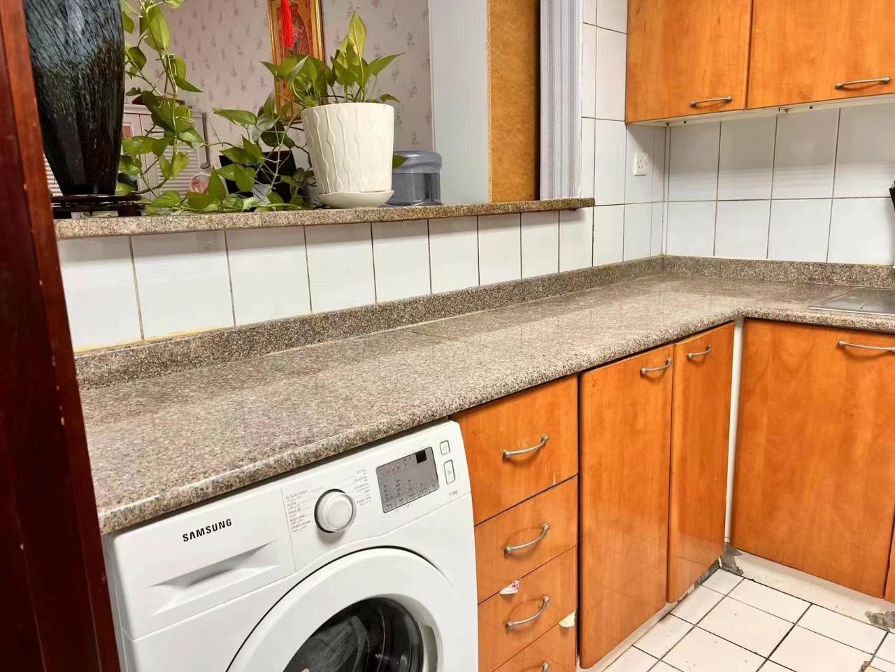 1;出租中国区F15一室一厅带阳台,带家具拎包入住,床,餐桌,冰箱,油烟机,柜子等,铺了木地板