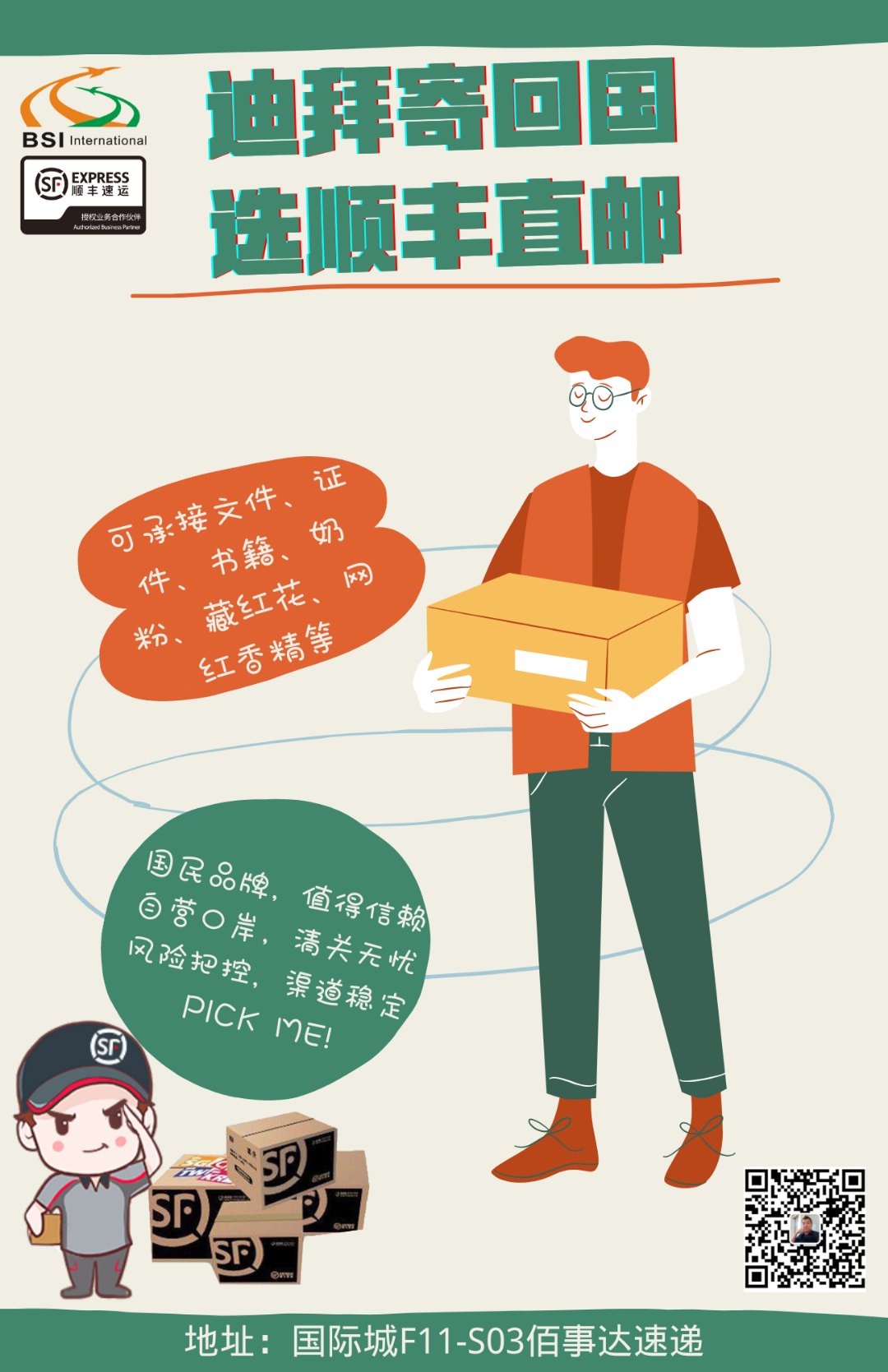 迪拜顺丰速运全程为你提供直邮服务,大量接收发货回国业务,业务操作范围:书籍,电子产品(不带电,产生税实报实销)证件,合同文件,婴儿奶粉,骆驼奶粉,