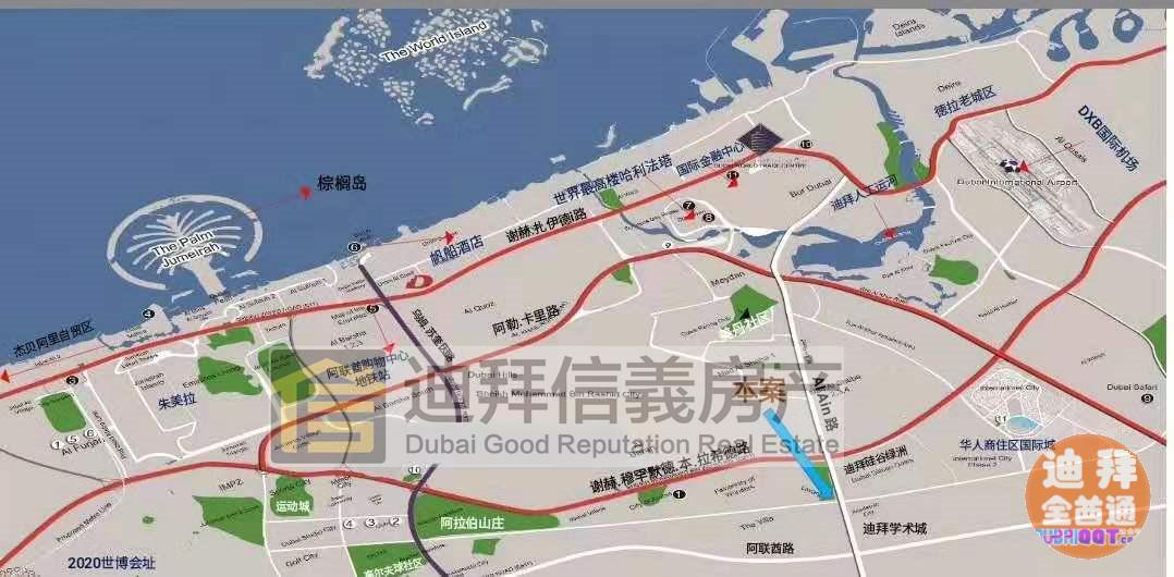 📍位于迪拜E311和Al Ain 路交汇处与迪拜大学城和硅谷绿洲为邻。开车到国际城10分钟,10中到地球村和IMG主题乐园,15分钟到国际机场新地铁和市区。