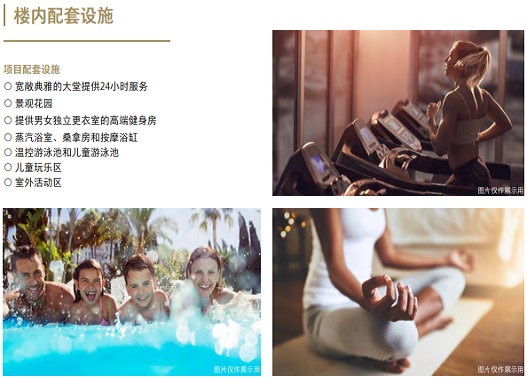 小区内部设有园林花园,温控游泳池,先进的健身房,提供男女分开的更衣室,蒸汽房和桑拿浴室,儿童游乐区和游泳池,室外活动区,健康疗养区,有棚停车场等等。