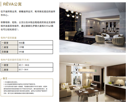 根据justproperty的房屋出租租金看,在商业湾区域的租金,套一一年为14万-20万人民币,套二租金一年有18万-30万人民币不等,所以,Reva公寓粗略来看,年回报率在10%左右,虽然**近几年迪拜租金下降趋势明显,但是像这种核心地铁保值能力抗跌能力还是很强。