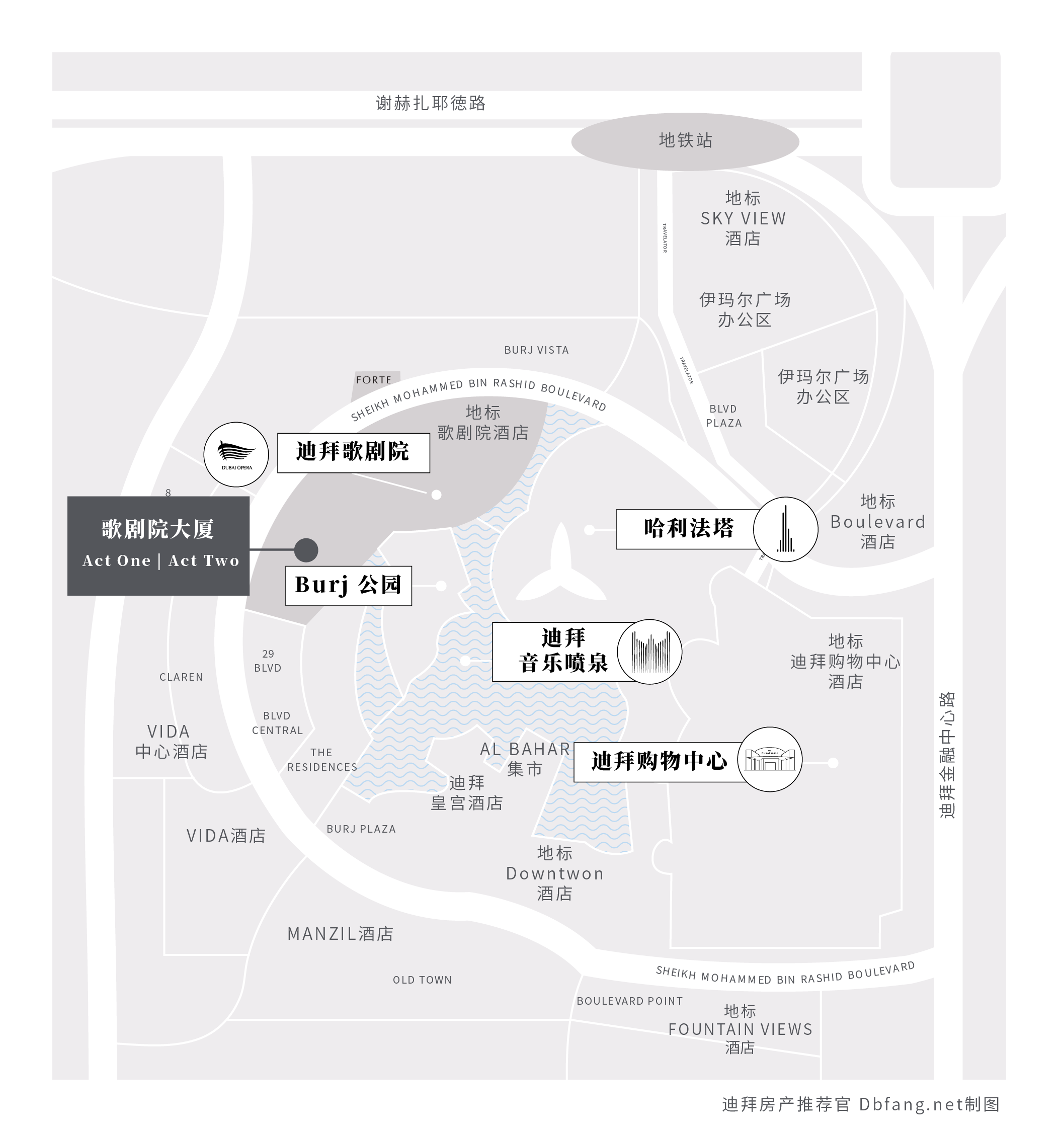 歌剧院大厦(Act one | Act Two)由两栋双子塔组成 ,位于市中心的歌剧院区域,设计来源于迪拜音乐喷泉,将成为迪拜市中心天际线的又一个亮点。提供1至3居室户型,以及**好的设施和市区景观。