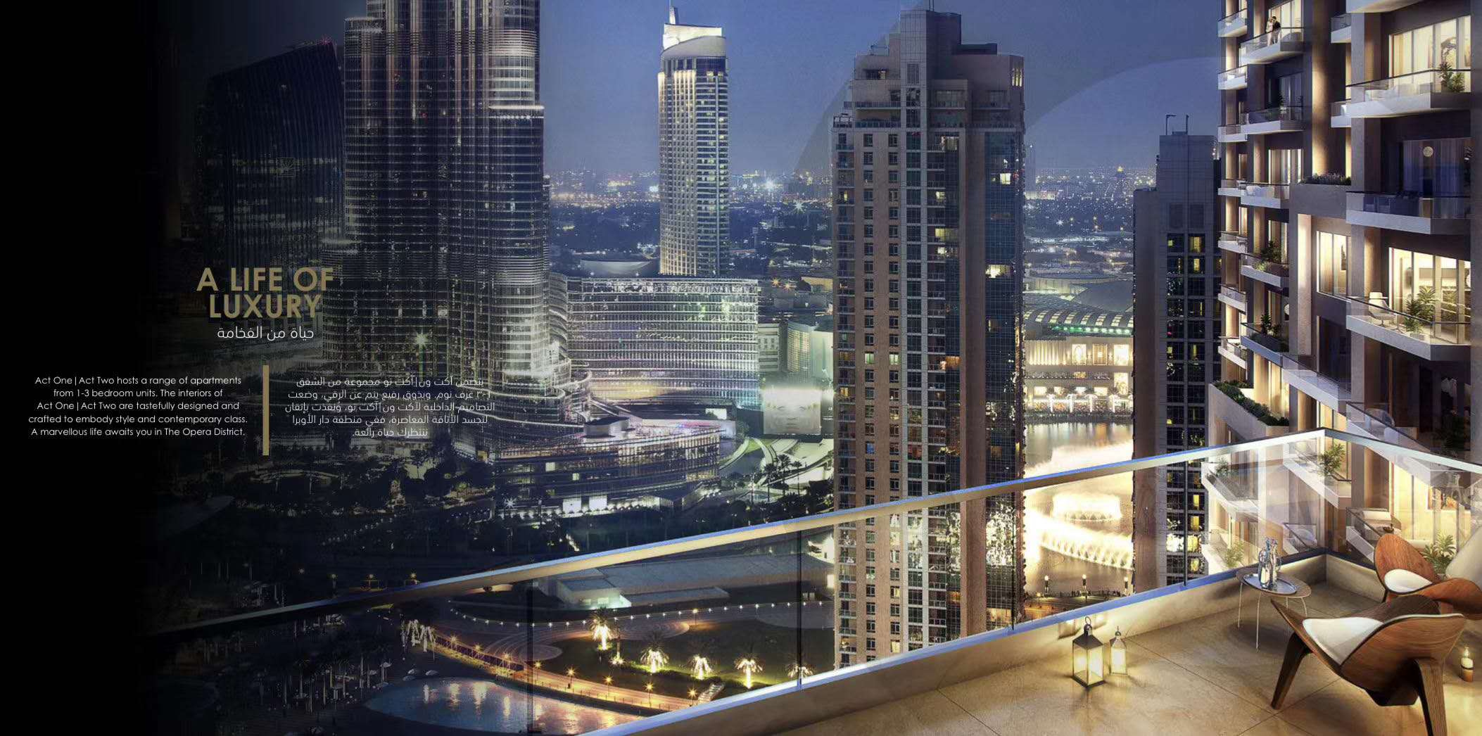 (Act One| Act Two)位于歌剧院区中心腹地, 特色鲜明,毗邻迪拜歌剧院,在这里可以欣赏到迪拜 音乐喷泉和哈利法塔梦幻般的景色。。两座大厦的设计 受到迪拜音乐喷泉的启发,除了设计了动态 外立面之外,这里也是通往享誉世界的项目 “哈利法塔”的大门。