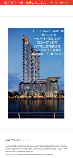 SOBHA 运河公寓 360度无死角 新项目开盘,我公司已为您锁定了**佳楼层 欢迎您来选购 一房97.5万起 一室一厅+书房118万 两室一厅 165万 两年物业管理费减免 2%土地局注册费减免 两年无息付款计划 看房电话+971505256898 微信:13608035457