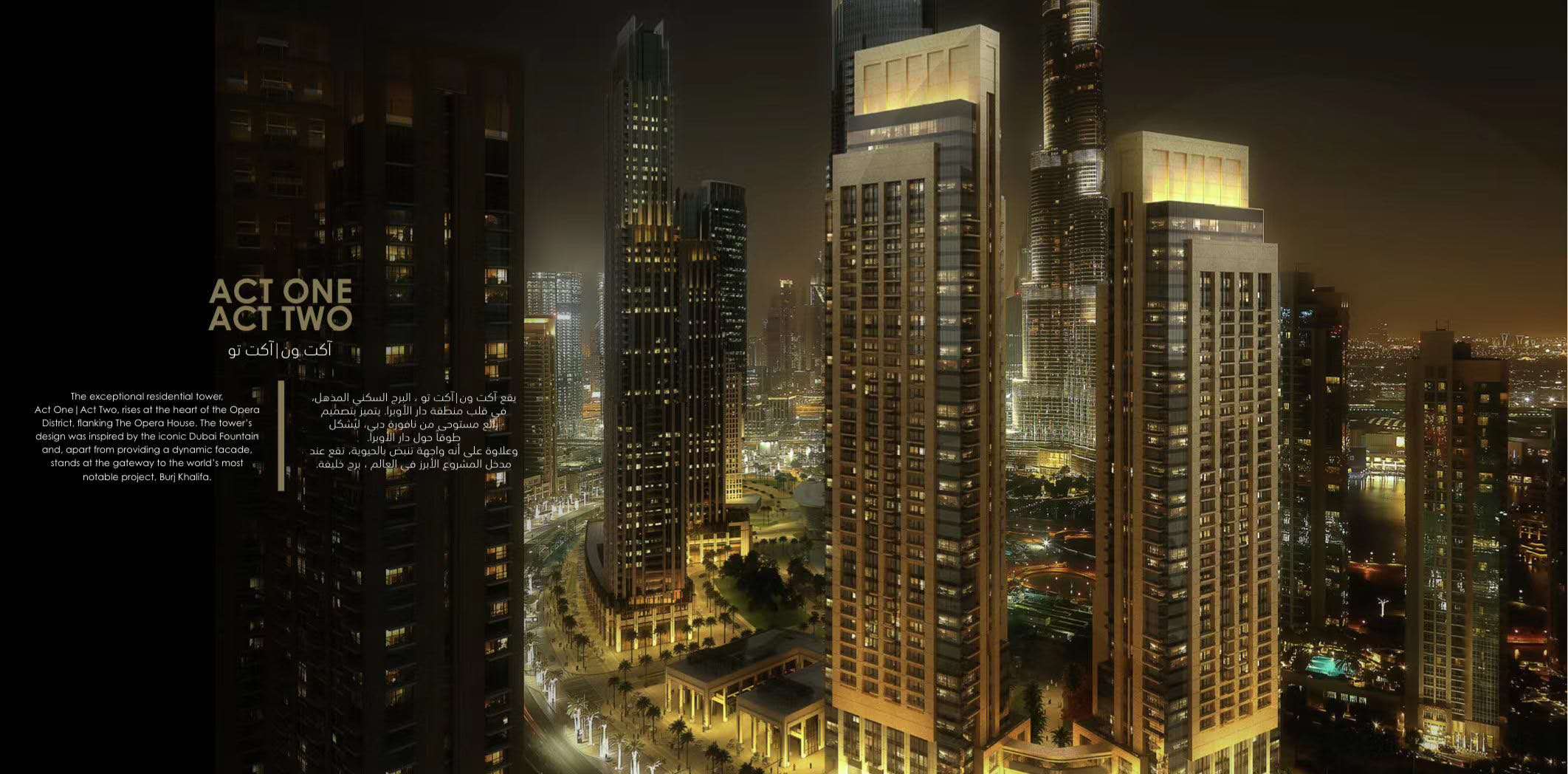 (Act One| Act Two)位于歌剧院区中心腹地, 特色鲜明,毗邻迪拜歌剧院,在这里可以欣赏到迪拜 音乐喷泉和哈利法塔梦幻般的景色。。两座大厦的设计 受到迪拜音乐喷泉的启发,除了设计了动态 外立面之外,这里也是通往享誉世界的项目 “哈利法塔”的大门。