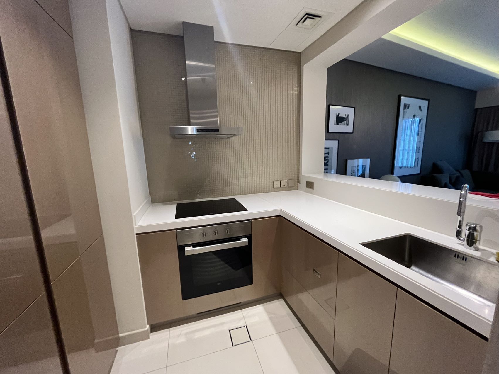* 厨房(现代半开放式,配有燃气灶、大理石台面和内置电器)