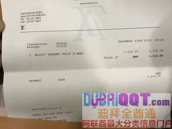 在酋长茂买的,结果又嫌7太小,换了7P,套也闲掉了。买的价格1110迪拉姆,LV专卖店发票,