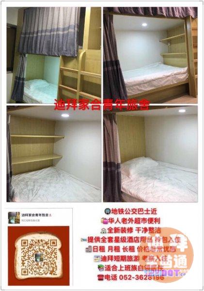 【迪拜家合青年旅舍 床位出租】地处迪拜德拉那撒广场华人聚集区,交通方便 距离地铁公交巴士近 华人老外超市便利 ,全新装修 干净整洁 提供全套星级酒店用品 拎包入住 可以提供 日租 月租 长租 价格非常优惠 适合迪拜短期旅游 考察 以及在迪拜商场 旅行社 或德拉店面上班的白领等长期居住 中央空调 并配冰箱 洗衣机 和厨灶 生活便捷 欢迎电话咨询看房 入住。联系电话 052-3628196(微信同号)【联系时一定要说【