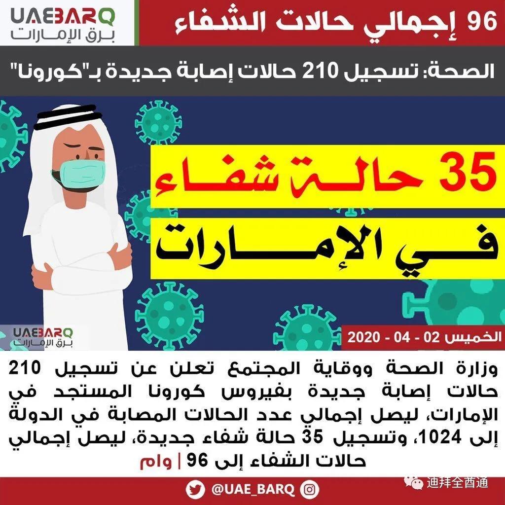 迪拜全酋通(ID:dibaiqqt) 据海湾新闻4月2日消息,阿联酋卫生部公布:新增新冠肺炎确诊病例210例,确诊病例总数增至1024例。阿联酋卫生和预防部同时宣布,康复35例。