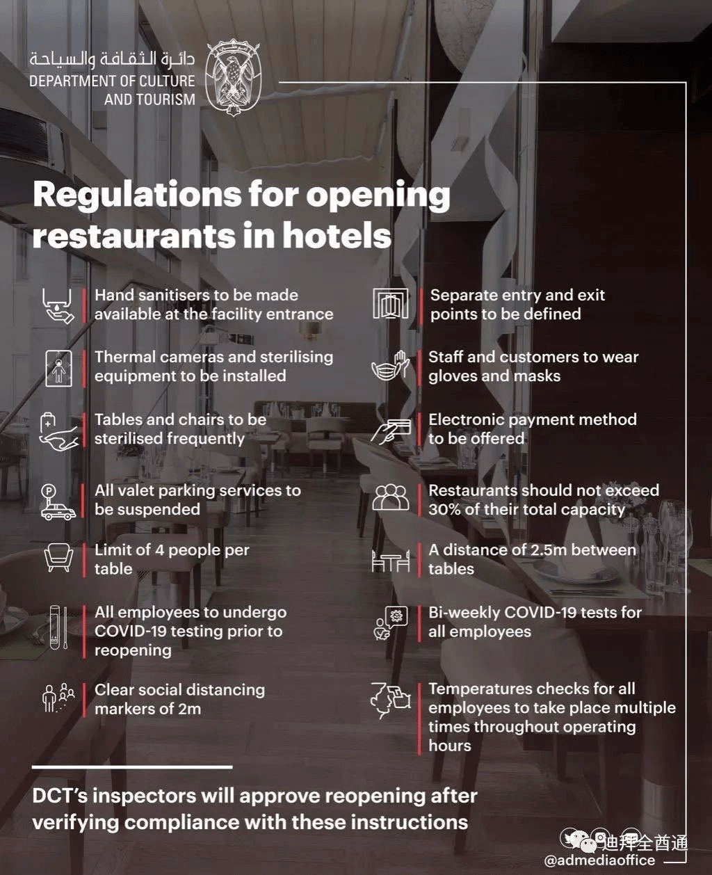 阿布扎比文化和旅游部(DCT Abu Dhabi)已经与阿联酋的酒店分享了详细的指导方针,准备批准重新开放酒店的餐厅、休息室、酒吧、海滩、游泳池和健身房等公共场所。阿布扎比旅游和营销总监HE Ali Hassan Al Shaiba说:“根据我们在各个方面支持和指导阿布扎比旅游部门的任务,我们与酒店合作伙伴共同采取的一系列措施将确保他们不仅能够尽早恢复营业,他们也将遵循确保所有成员安全和有保障的准则。”