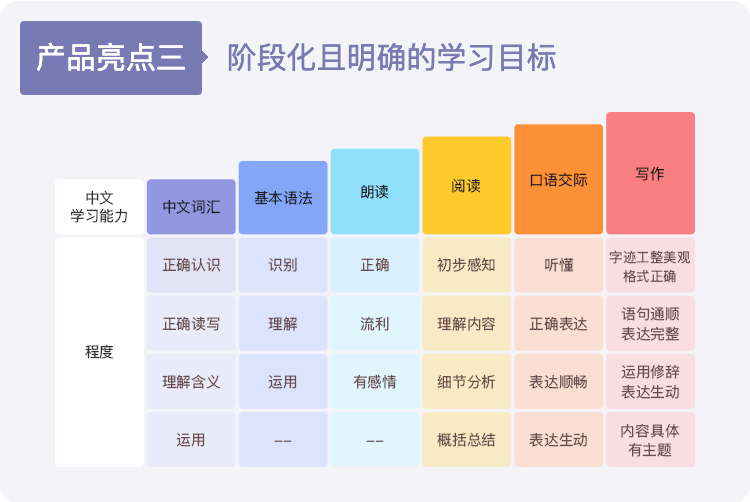 这是因为,对于这个层次的孩子,我们一上来不会让他们学习和记忆复杂的汉字,以激发孩子的学习兴趣为主,调动孩子想象力和表达欲,重点提升孩子的听说水平。