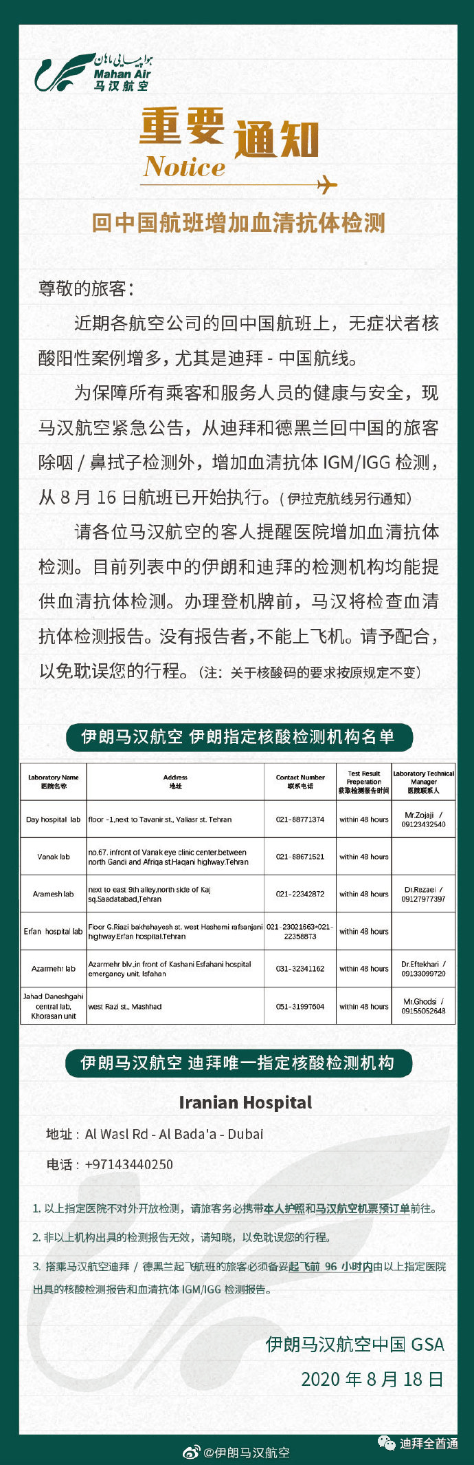 迪拜全酋通据马汉航空官方微博8月18日 消息,近期各航空公司的回中国航班上,无症状者核酸阳性案例增多, 尤其是迪拜-中国航线。为保障所有乘客和服务人员的健康与安全,现马汉航空紧急公告,从迪拜和德黑兰回中国的旅客除咽/鼻拭子检测外,增加血清抗体IGM/IGG检测,从8月16日航班已开始执行。