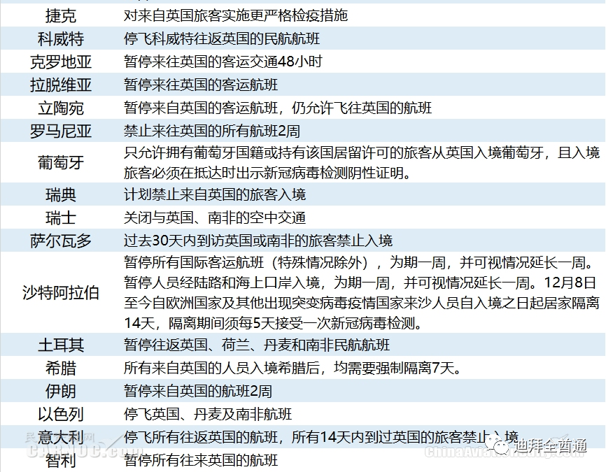沙特:沙特内政部当地时间12月20日晚发布通告,称为应对在多国出现的新冠病毒新变种及其引发的疫情,沙特政府将从即日起暂停所有国际客运航班(特殊情况除外),同时将暂停人员经陆路和海上口岸入境,相关措施将实施为期一周,并可视情况延长一周。
