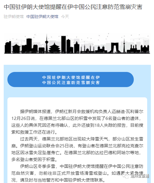 雪崩袭击了伊朗首都附近地区,驻伊朗大使馆发布一则重要提醒!