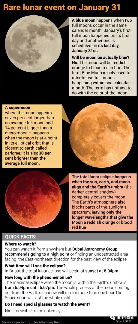 迪拜:今年1月31日,152年一遇的“蓝月”+“超级月亮”+“月全食”三景合一将会出现在阿联酋!